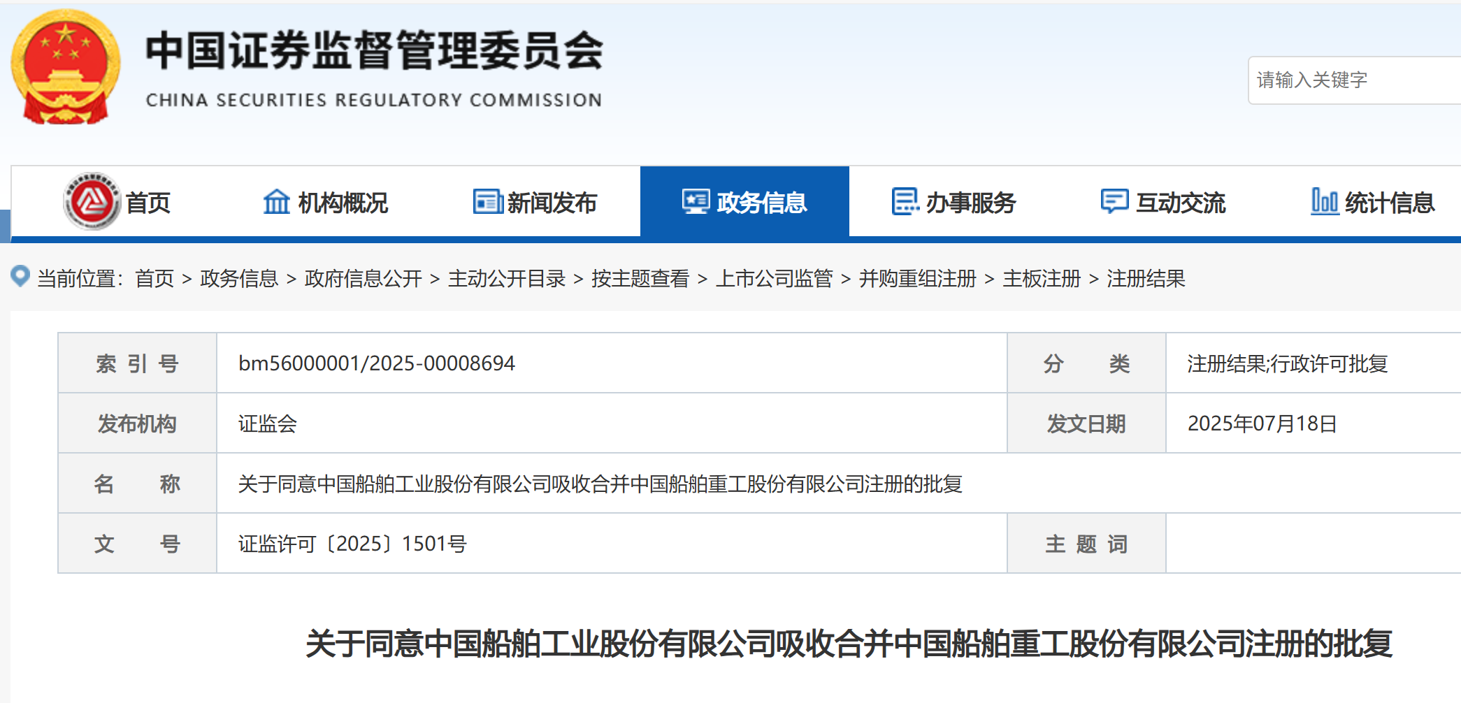 上证报中国证券网讯(记者 高志刚)7月18日,中国证监会发布公告,正式核准中国船舶通过换股方式吸收合并中国重工,标志着中船集团旗下两大船舶总装核心上市平台的整合工作取得重大突破性进展。