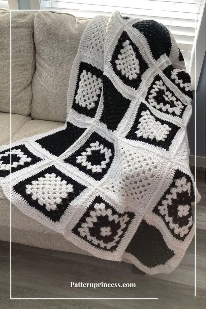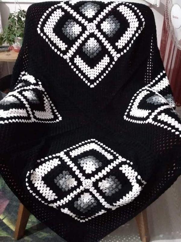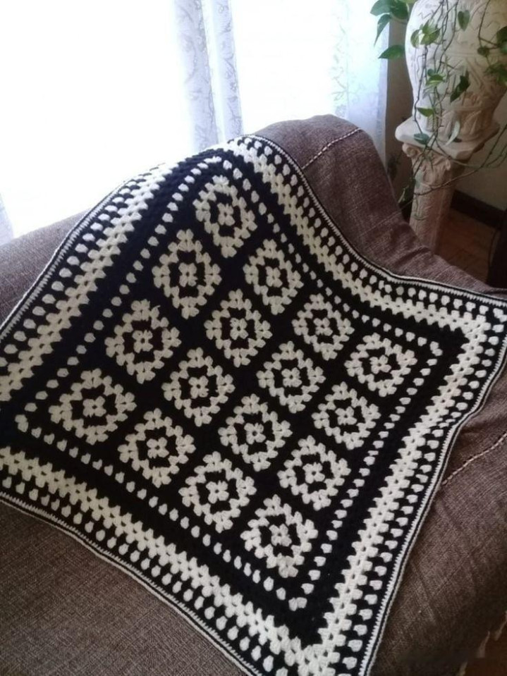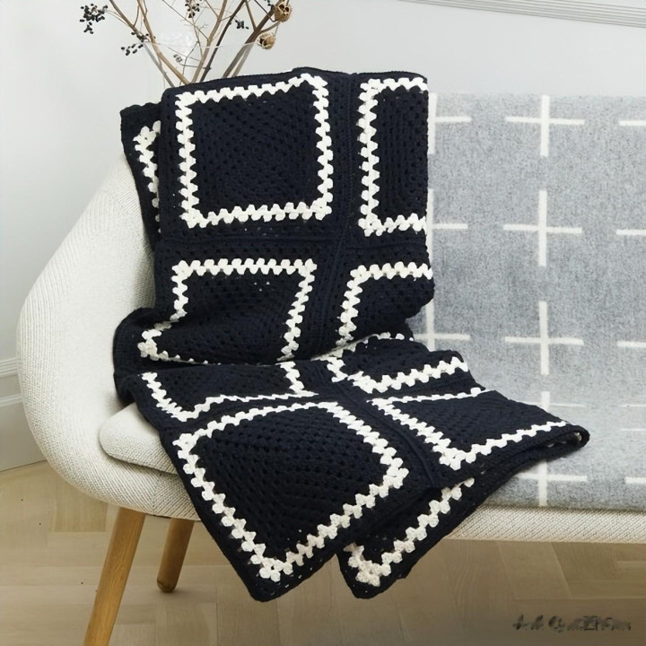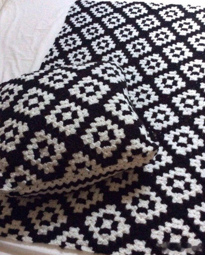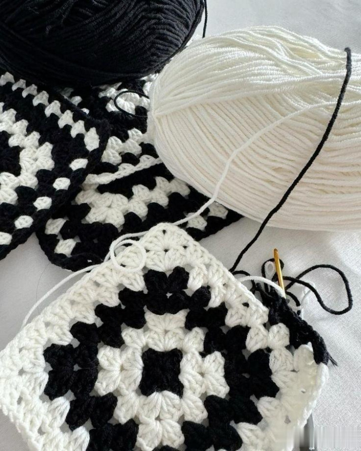 :万能祖母方格新手易钩、拼接灵活;黑白撞色视觉张力强且百搭不挑家;大尺寸适配多场景,手工肌理添温馨却不杂乱。